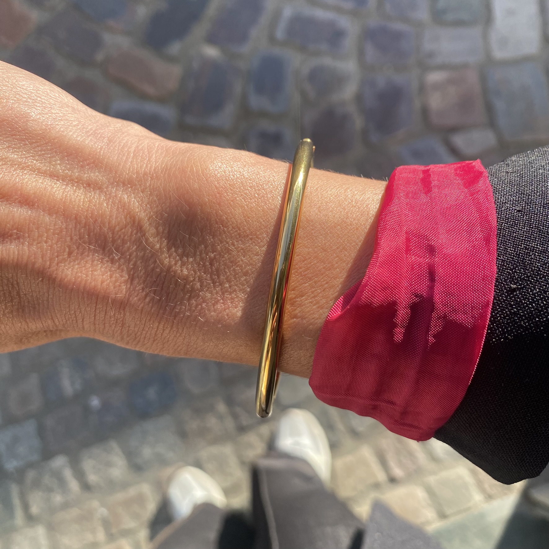 Armring i guldfarvet stål med rund profil og 4 mm bredde.