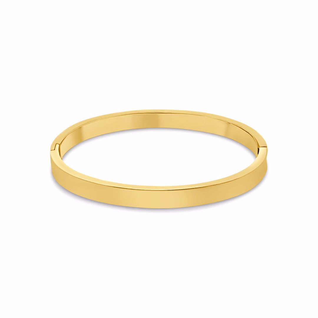 Armring i guldfarvet stål med flad profil og 6 mm bredde.