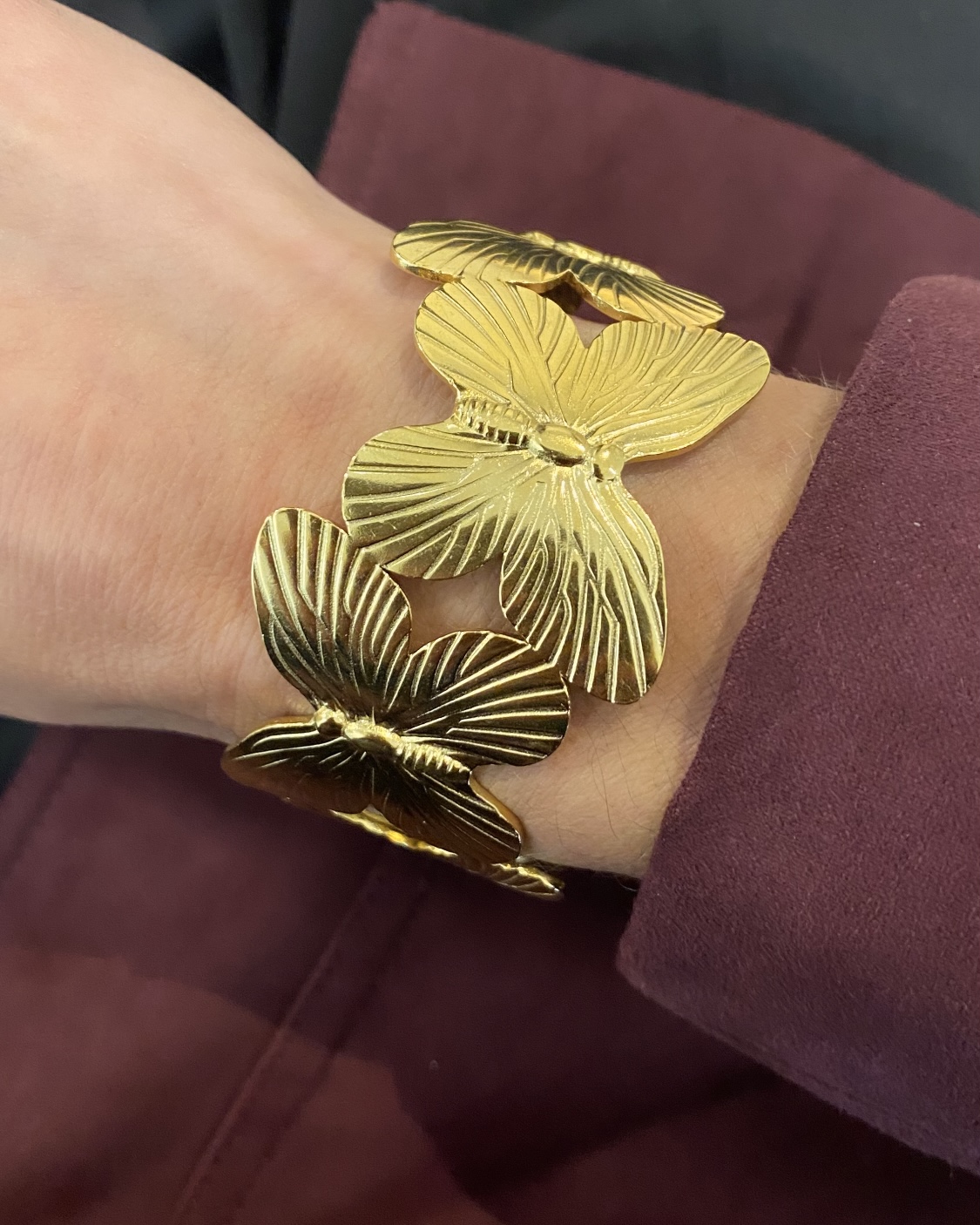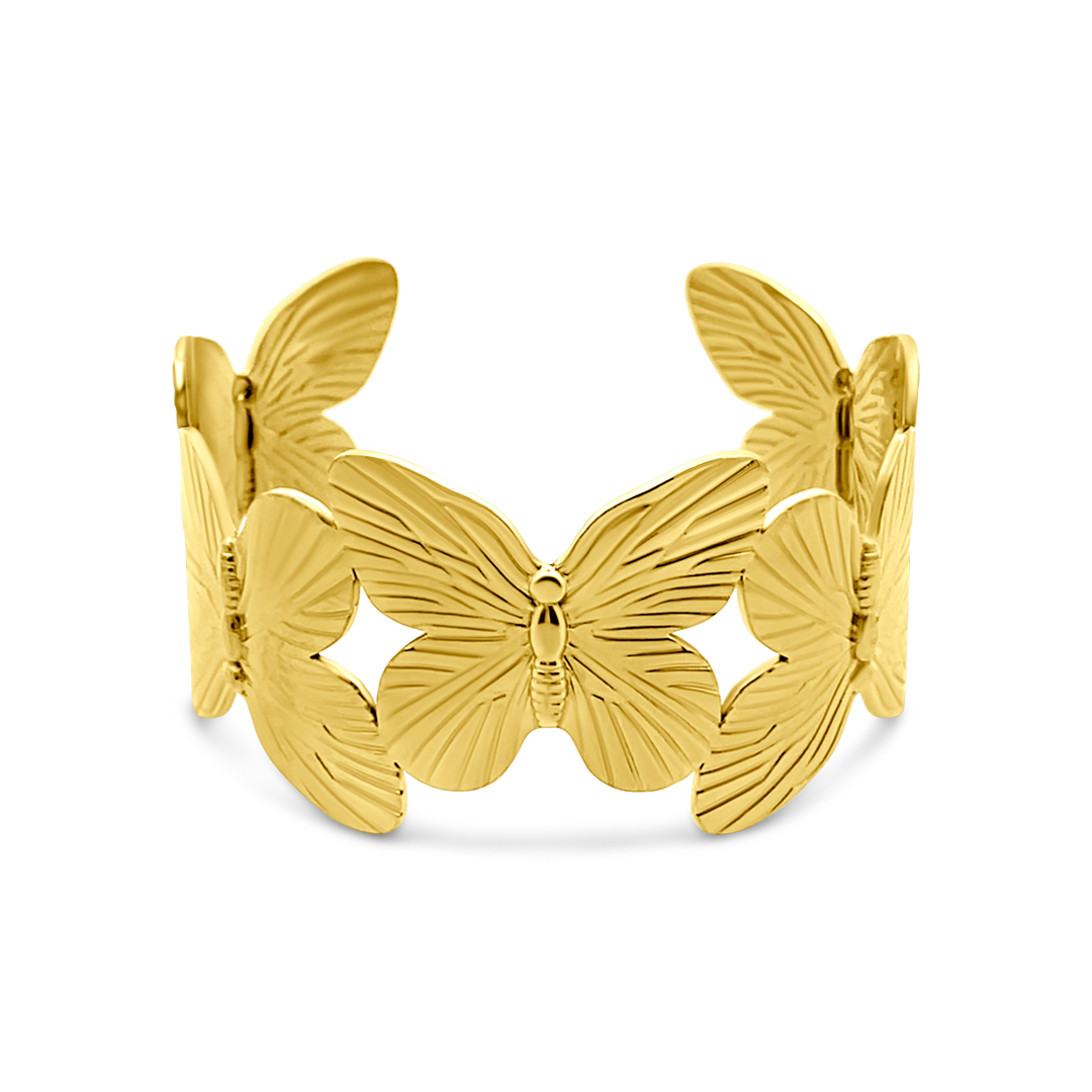 Statement armring i guldfarvet stål med fine sommerfuglemotiver.