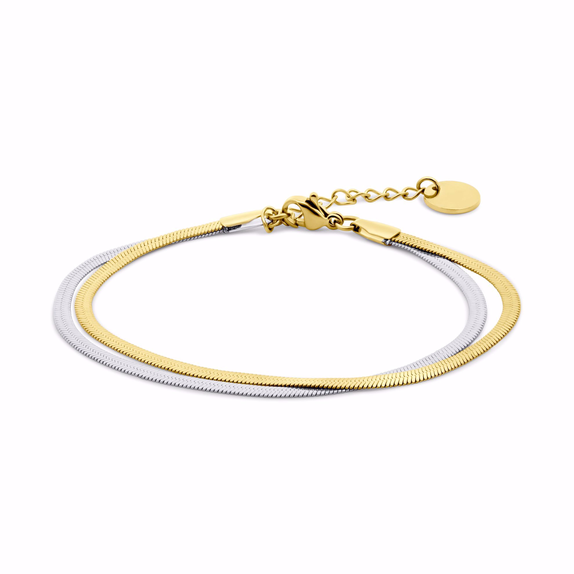 Dobbelt armbånd i stål og PVD‑guldfarvet stål – flad slange – CO88