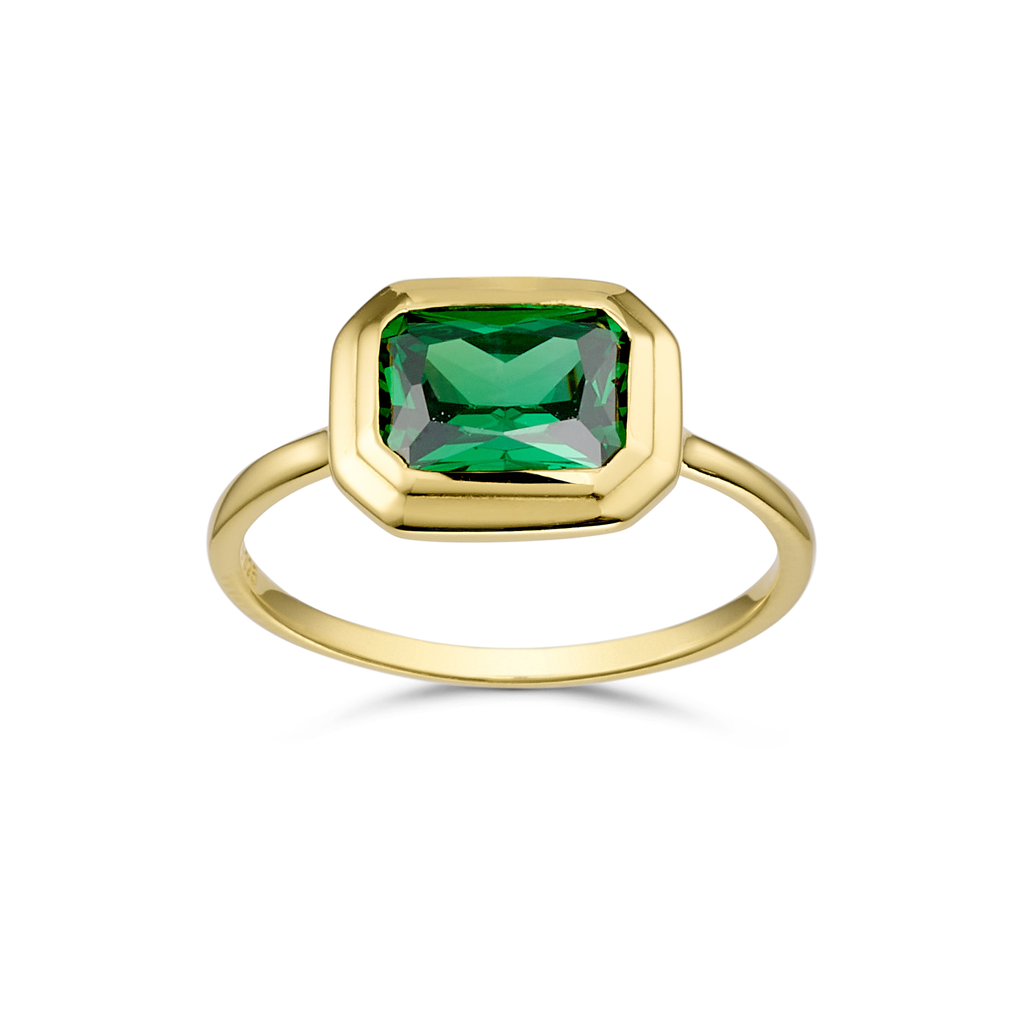 Forgyldt ring med grøn emerald‑cut zirkonia.