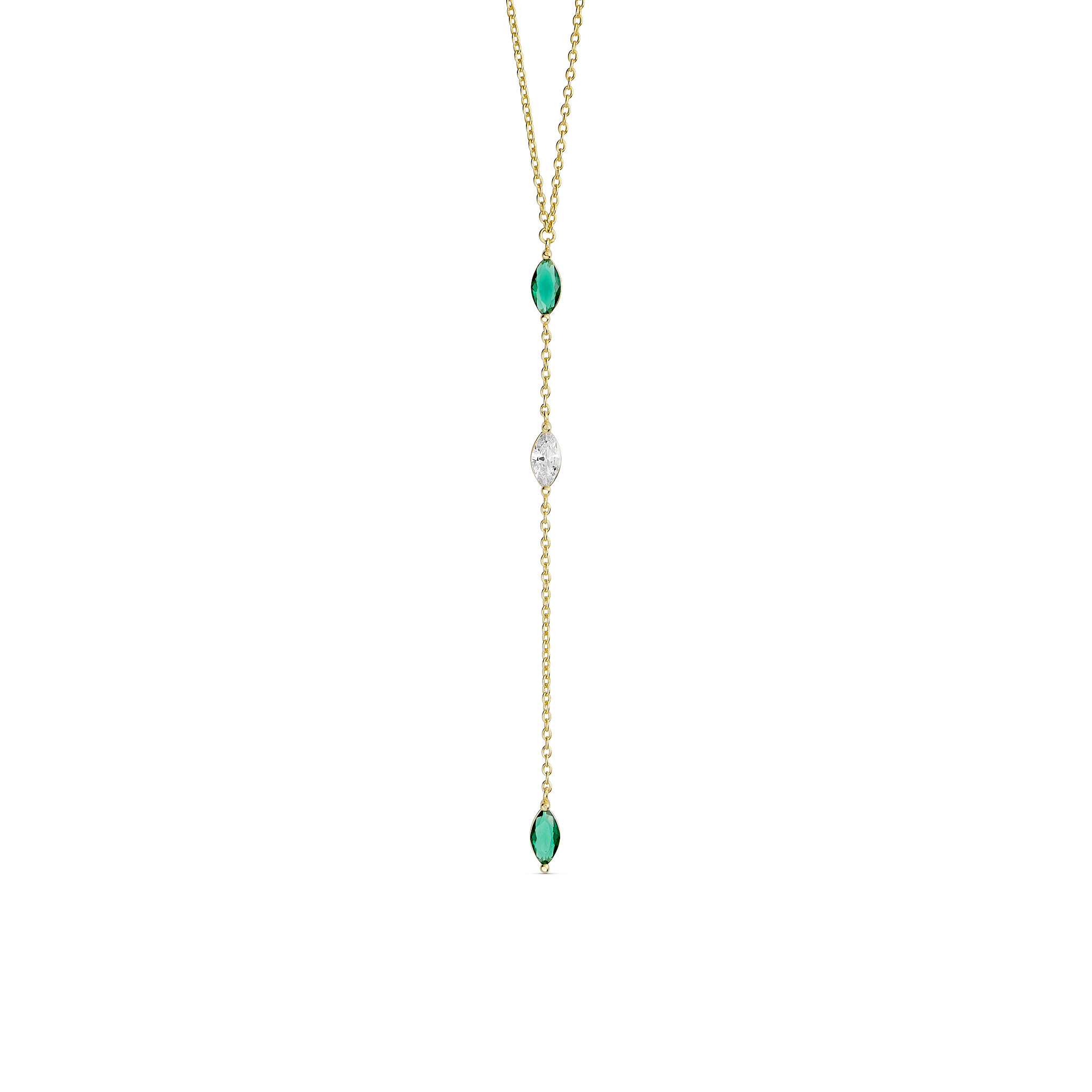 Denne Y‑halskæde fra Seville Jewelry er udført i forgyldt 925 sterling sølv og prydet med to grønne zirkonia og én klar zirkonia, alle i marquise‑form. Kæden måler 42 cm og har et forlængerstykke på 5 cm, så længden kan justeres. Vedhænget falder i en slank linje på 7,5 cm, hvilket giver smykket en elegant og let stil.