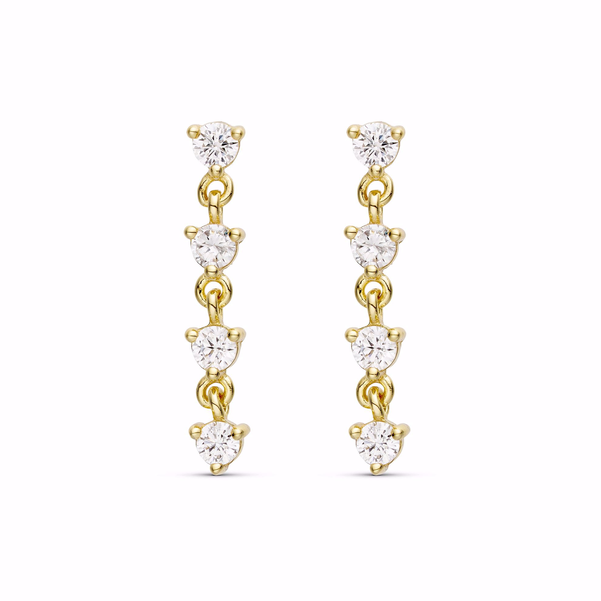 Disse hænge øreringe fra Seville Jewelry er lavet i forgyldt 925 sterling sølv og sat med fire klare zirkonia i en lodret række. De små led mellem stenene giver en let bevægelse, og formen gør dem velegnede både til hverdagsbrug og til mere festlige anledninger. Længden er 1,8 cm.