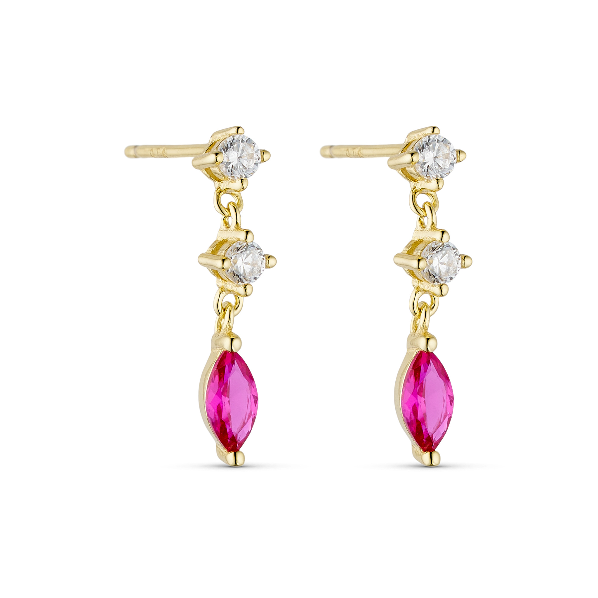 Disse øreringe fra Seville Jewelry har et roligt og stilrent udtryk med to klare zirkonia sten og en pink marquise‑formet sten nederst. De små led mellem stenene giver en fin bevægelse, når øreringene bæres.