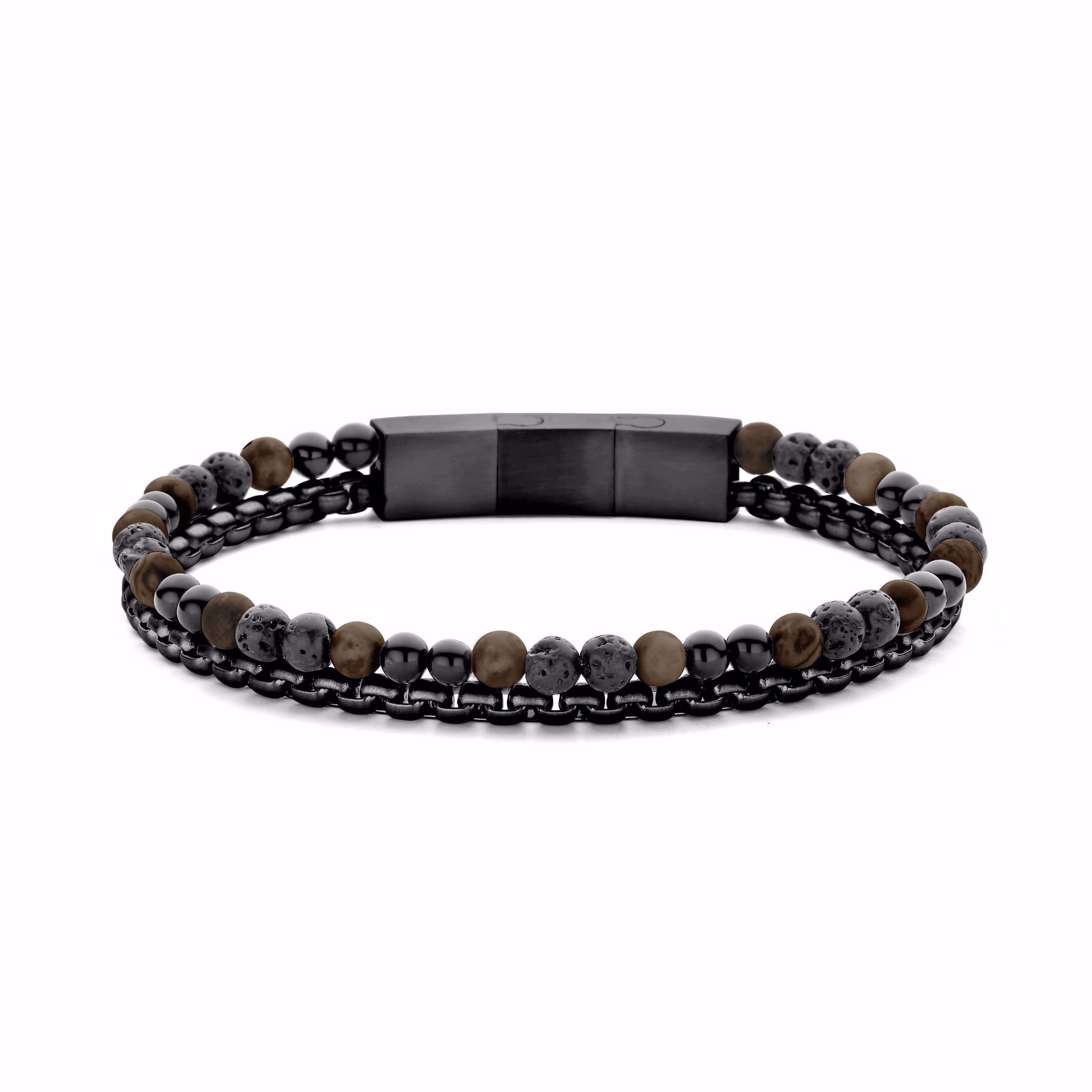 Lækkert herre armbånd perfekt til den moderne herre. I Frank167 armbåndet sidder der 4 mm sorte lavasten, sorte blanke agat sten & brune tigerøje sten sammen med et robust, men slank stål kæde, som tilføjer armbåndet et strejf af maskulinitet. Den lækre kombination af sten og sort stål fuldendes af den geniale låseforlængerfunktion, der sikrer en sikker og justerbar pasform til håndled op til 21 cm.