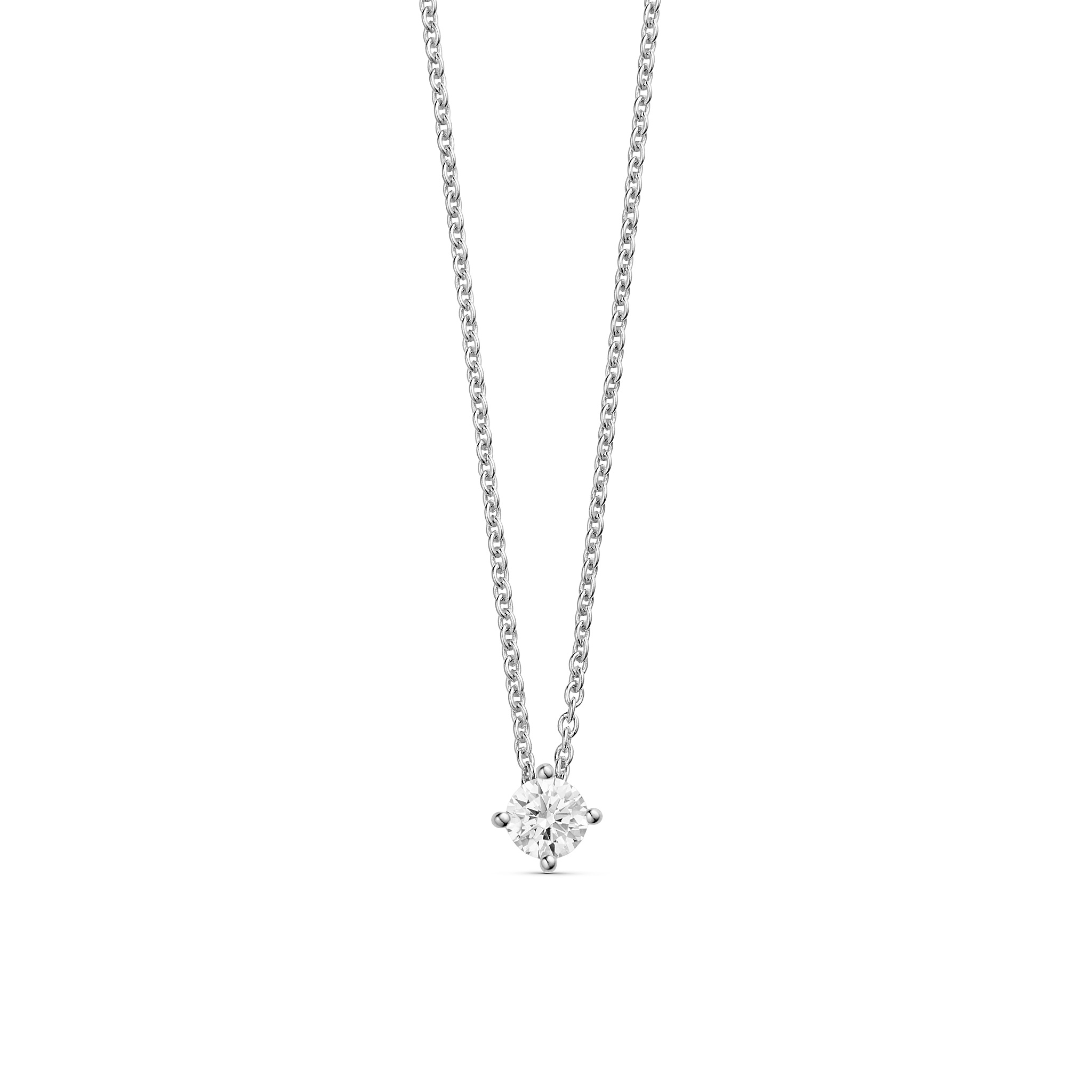 Denne halskæde fra Guld & Sølv Design er udført i rhodineret 925 sterling sølv og har et enkelt vedhæng med en klar zirkonia, fastholdt af fire grabber. Det minimalistiske design gør den nem at style sammen med andre smykker — eller bære alene for et helt rent og enkelt look. Kæden måler 42 cm og har et forlængerstykke på 3 cm, så længden kan justeres efter ønske.