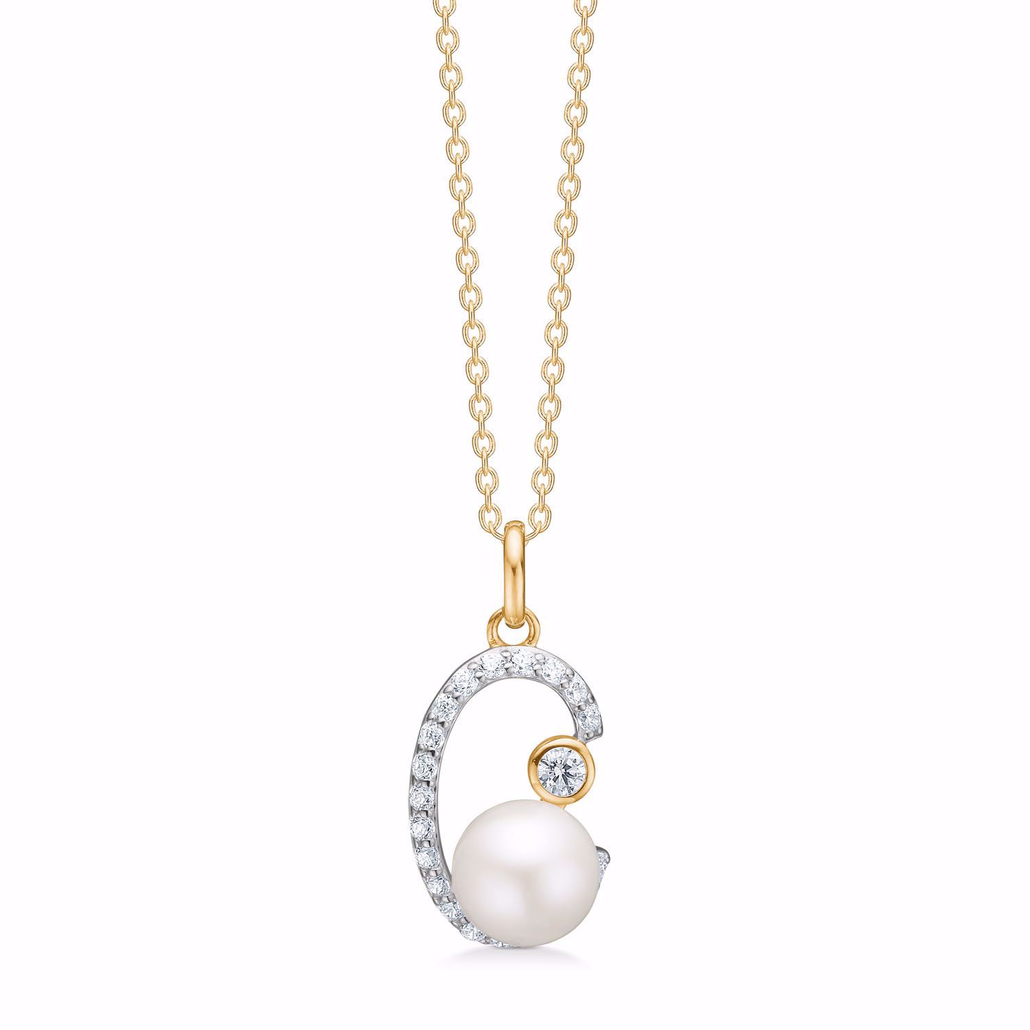 Vedhænget er i 8 karat guld med klar zirkonia sten & hvid ferskvandsperle