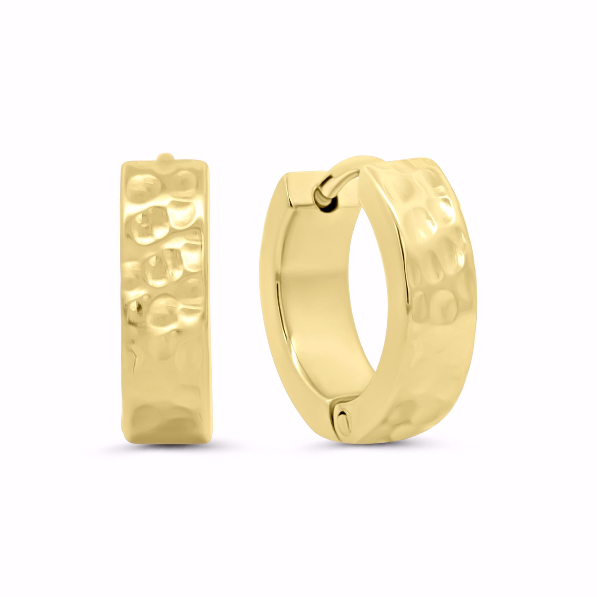 Disse 10 mm hoops fra CO88 har et markant, tekstureret look, hvor den hamrede overflade giver en rå vibe. Den blanke PVD‑guldbelægning tilfører en intens glød, der gør kontrasten mellem struktur og shine ekstra tydelig.