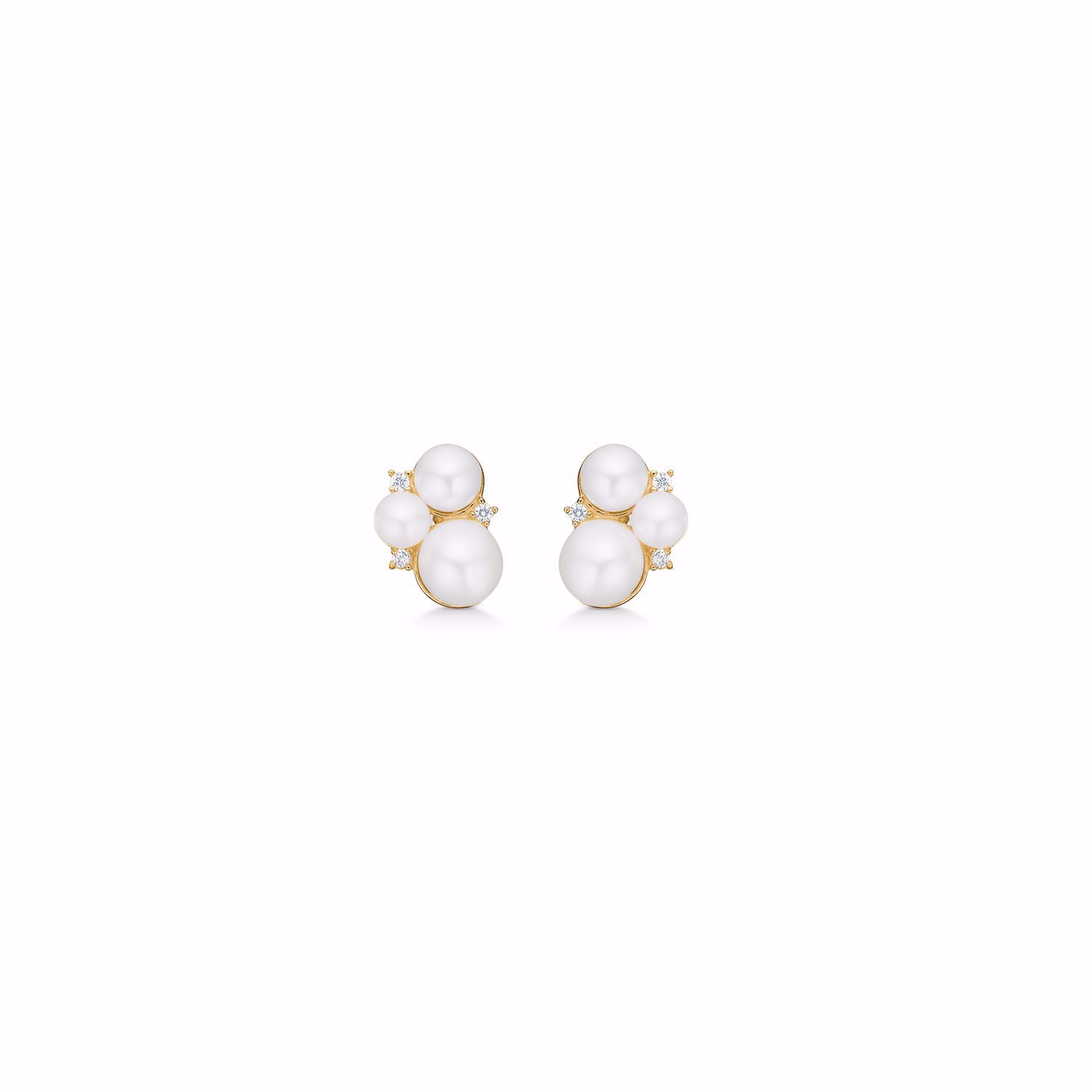 Stilfulde ørestikker i 8 karat guld med 3 hvide ferskvandsperler hvor der mellem perlerne sidder 3 stk klare zirkonia sten.
