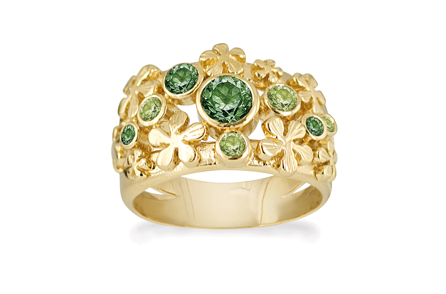 Den brede smukke ring er udført i forgyldt 925 sterling sølv i et blomster design med smukke grønne peridoter & kvarts