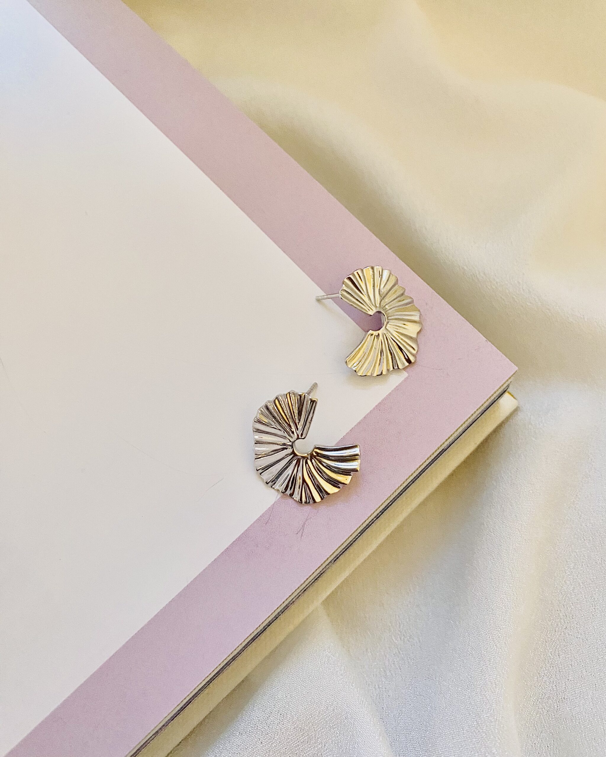 Den åbne halvcirkel form fremhæver et asymmetrisk look, som giver en følelse af bevægelse og elegance. Øreringene er minimalistiske og kunstneriske på samme tid, hvilket gør dem perfekte til både hverdagsbrug og mere festlige lejligheder. Detaljerne i foldningen får dem til at ligne små, delikate kunstværker, hvilket giver et sofistikeret og stilfuldt udtryk.
