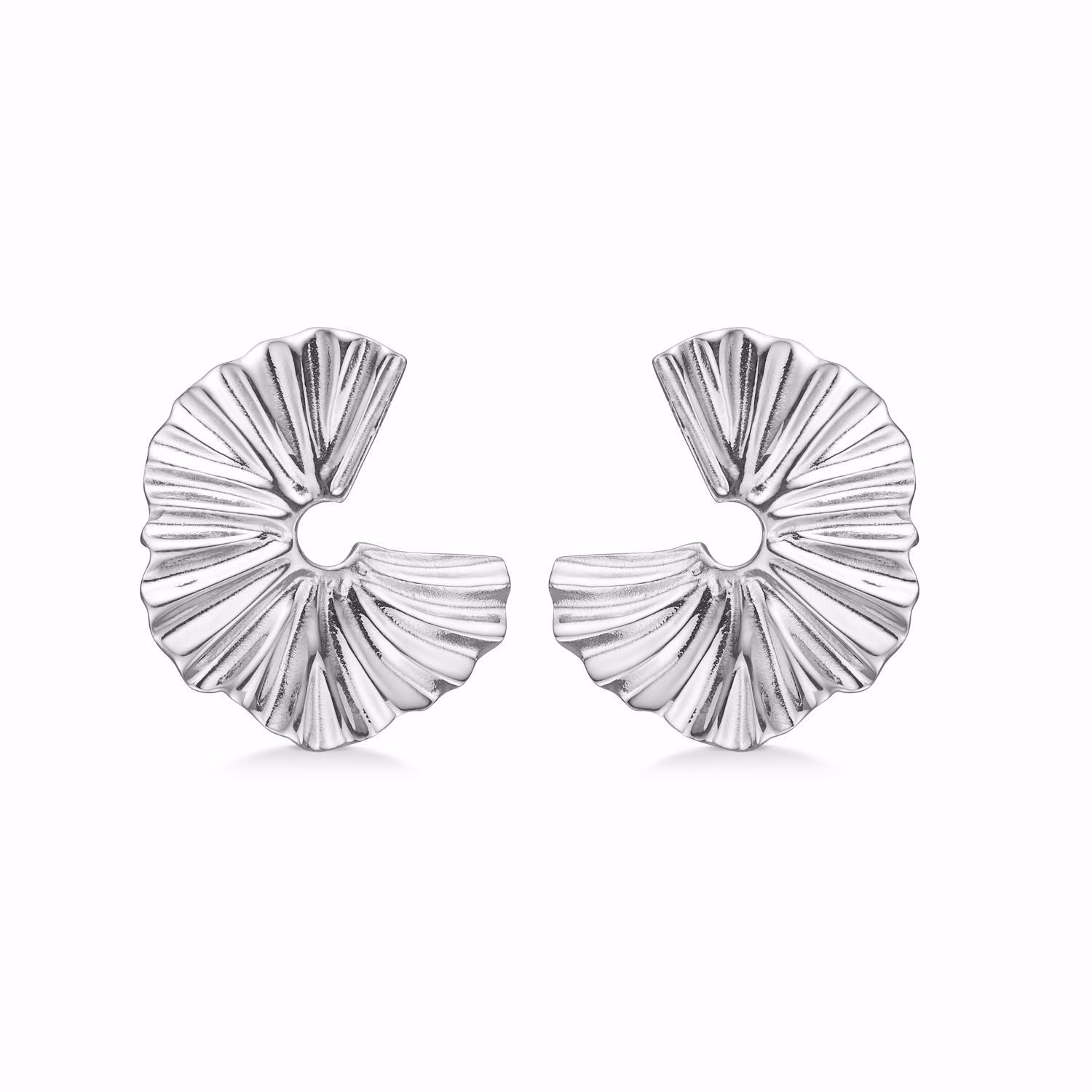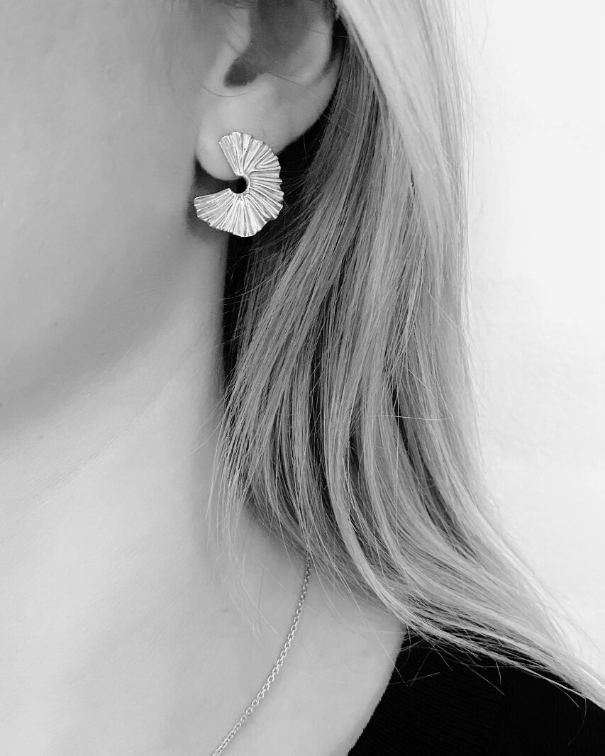 SELMA øreringene fra Seville er moderne og karakteristiske med et skulpturelt design. De er fremstillet i 925 sterling sølv og har en form, der minder om en halvcirkel med en foldet, næsten muslingeformet struktur. Detaljerne er præget af bløde, strålende linjer, der skaber en reflekterende overflade og giver øreringene et levende, dynamisk udseende.