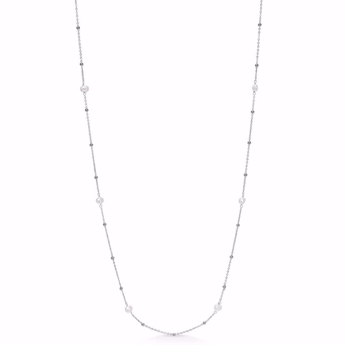 Flot perle halskæde fra Seville Jewelry i 925 sterling sølv. Halskæden er 80 cm lang og har langs kæden fine hvide ferskvandsperler og små sølv kugler. Et klassisk og altid populært smykke som er nem at style sammen med andre smykker.