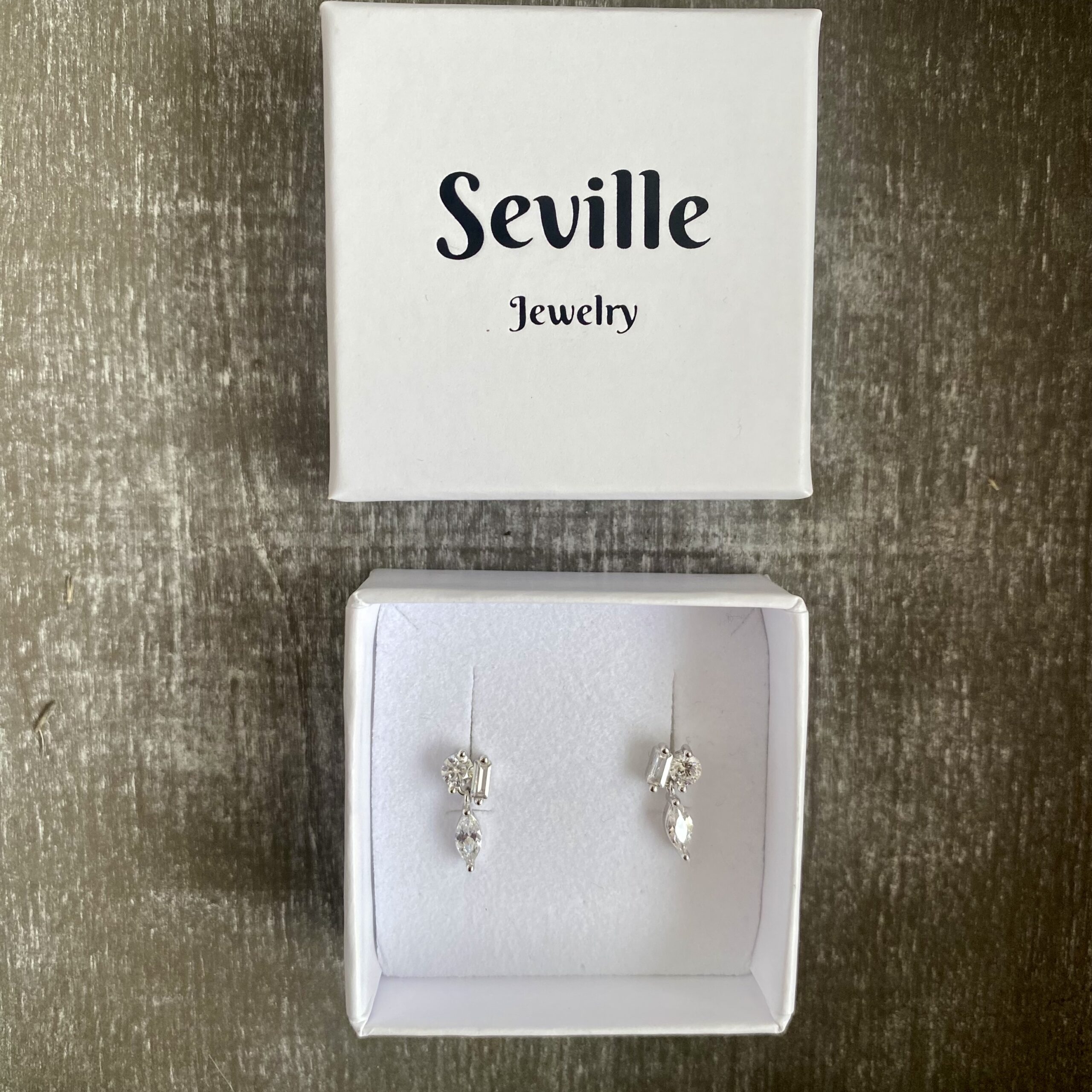 Disse små hænge øreringe fra Seville Jewelry er lavet i 925 sterling sølv og sat med klare zirkonia i tre forskellige faconer. De måler 1,2 cm i længden og har et roligt og afbalanceret udtryk, hvor den nederste sten giver en let bevægelse, uden at smykket bliver tungt.