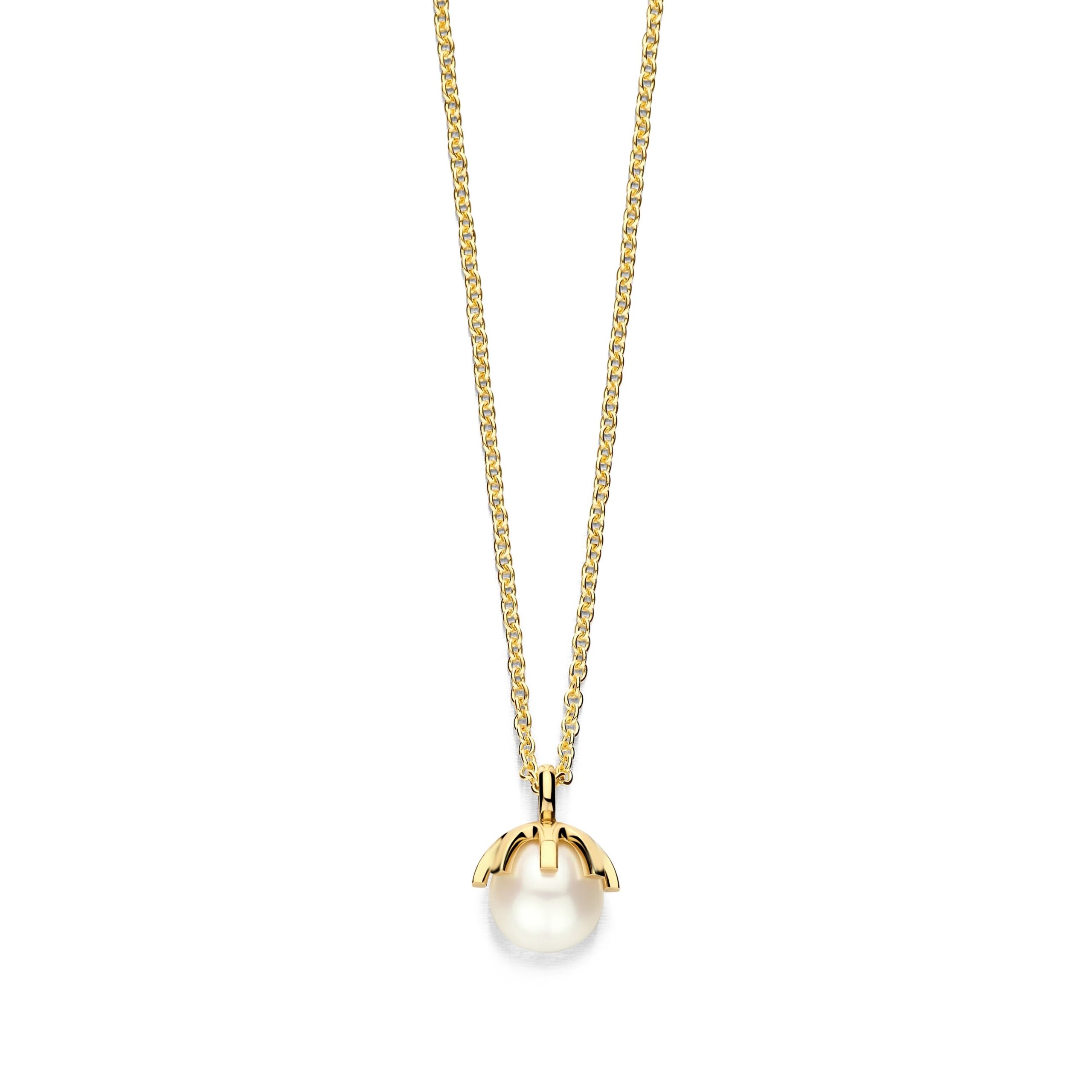 Let og feminin halskæde med skinnende perle i forgyldt sølv. Justerbar længde – perfekt til både hverdag og fest.